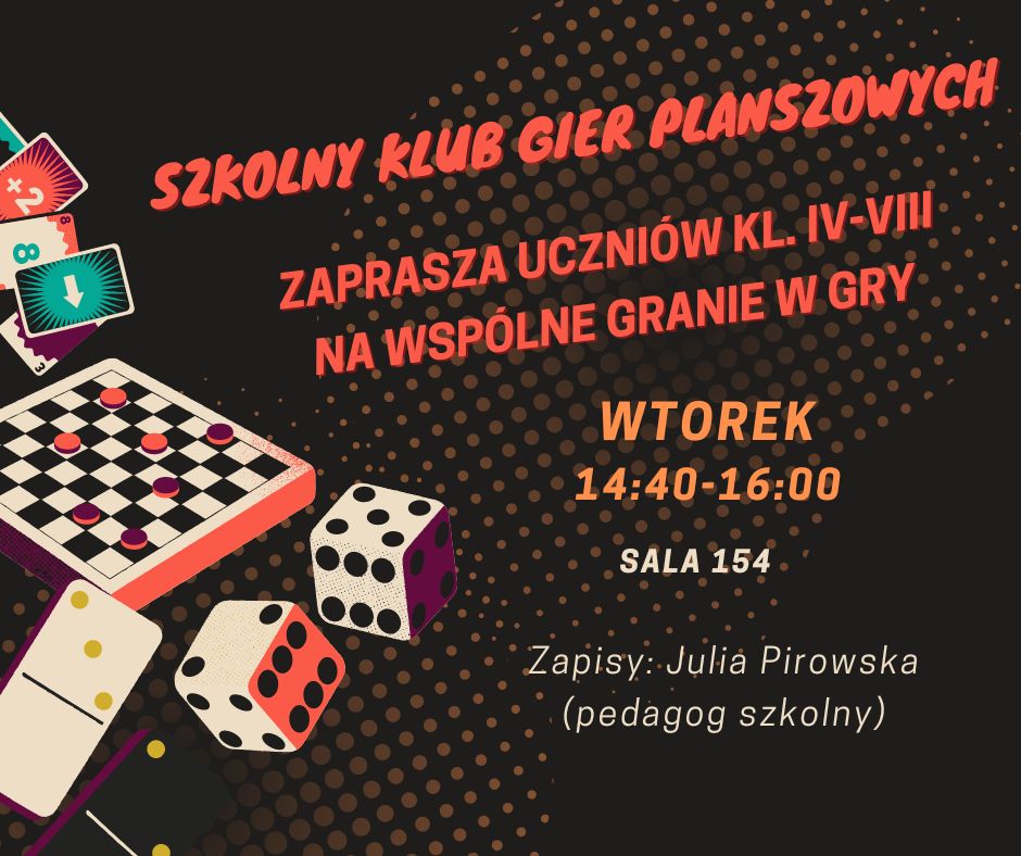 Start pierwszych zajęć już 7 października! Nie zwlekaj, wstąp do Szkolnego Klubu Gier Planszowych. Szczegółowe informacje udziela pedagog szkolny Julia Pirowska.