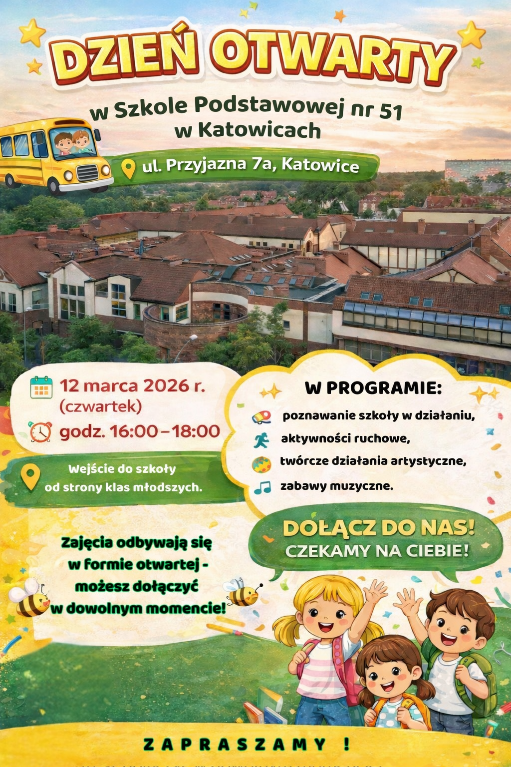 Serdecznie zapraszamy wszystkie dzieci wraz z rodzicami na Dzień Otwarty, który odbędzie się w Szkole Podstawowej nr 51 w Katowicach!