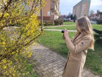 Lekcja informatyki w plenerze. Tym razem zamiast wykorzystywać gotowe grafiki, klasa 8e postanowiła samodzielnie zgromadzić materiały potrzebne do wykonania projektu "Wiosna w obiektywie".